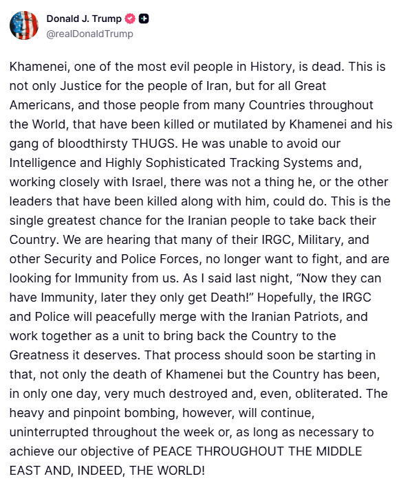 وقال ترامب إن خامنئي «أحد أكثر الأشخاص شرًا في التاريخ، قد مات»، معتبراً أن ذلك «ليس عدالة للشعب الإيراني فحسب، بل لكل الأميركيين، ولأولئك الذين قُتلوا أو شُوّهوا على يده».
