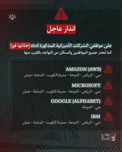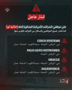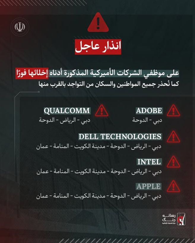 وبحسب الصور المتداولة، فإن التحذير يطلب من موظفي عدد من الشركات الأميركية في الشرق الأوسط إخلاء مواقعهم فوراً، كما يحذر السكان من التواجد بالقرب من تلك المواقع.